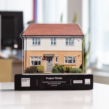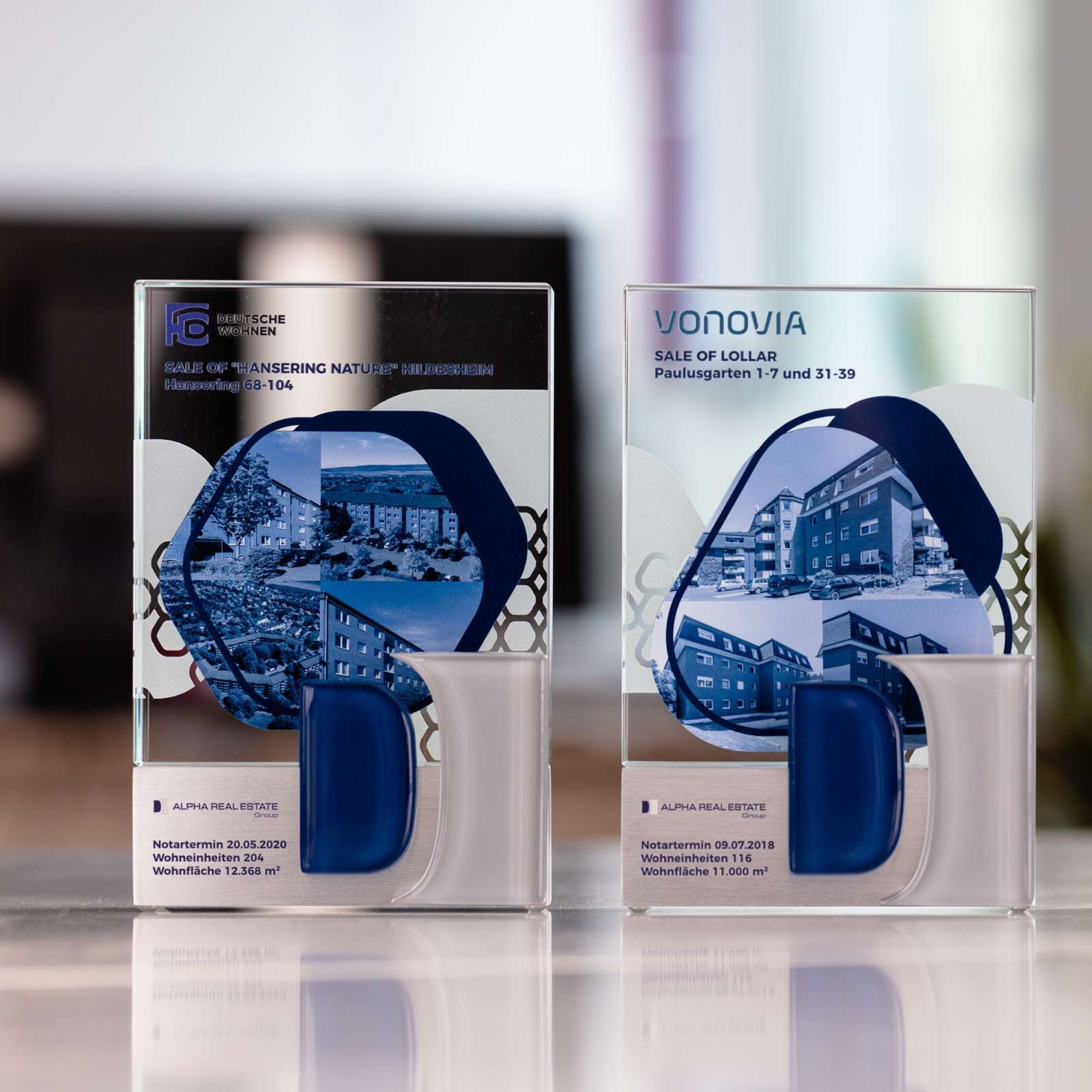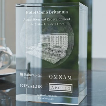 Recognise the completion of a project or deal by opting for a glass deal tombstone to make sure the successes are remembered and celebrated for many years to come.Getting a financial tombstone made from glass will always be the gold standard when celebrating exceptional deals or milestones for a company. The heavy weight of the glass guarantees the recipient feels like the award is valuable, meaningful and that the success has been recognised. Another benefit of using glass is that the surface is tough and it is much less susceptible to scratches or imperfections than other materials, such as acrylic, meaning it will look neat and fresher for many years to come.Glass awards can be enhanced and embellished in many ways – we can paint them, engrave, and paint fill, 3D engrave inside or colour print. We can add colour fused glass for logo details, and we can even add colour inside by layering colour printed glass panels! The choice is yours. And moreover, here at EC Awards, we offer a free, full-design service, so whether you already know what you want your Glass Deal Tombstone to look like, or if you need any advice, we’re here to help. Check out some of our glass deal tombstones for inspiration below. We have no minimum order requirements and usually take 1-2 weeks for delivery, but might be able to get them sooner in some exceptional circumstances, so please always ask.For any additional information, or to order your Glass Deal Tombstones, please get in touch with us.