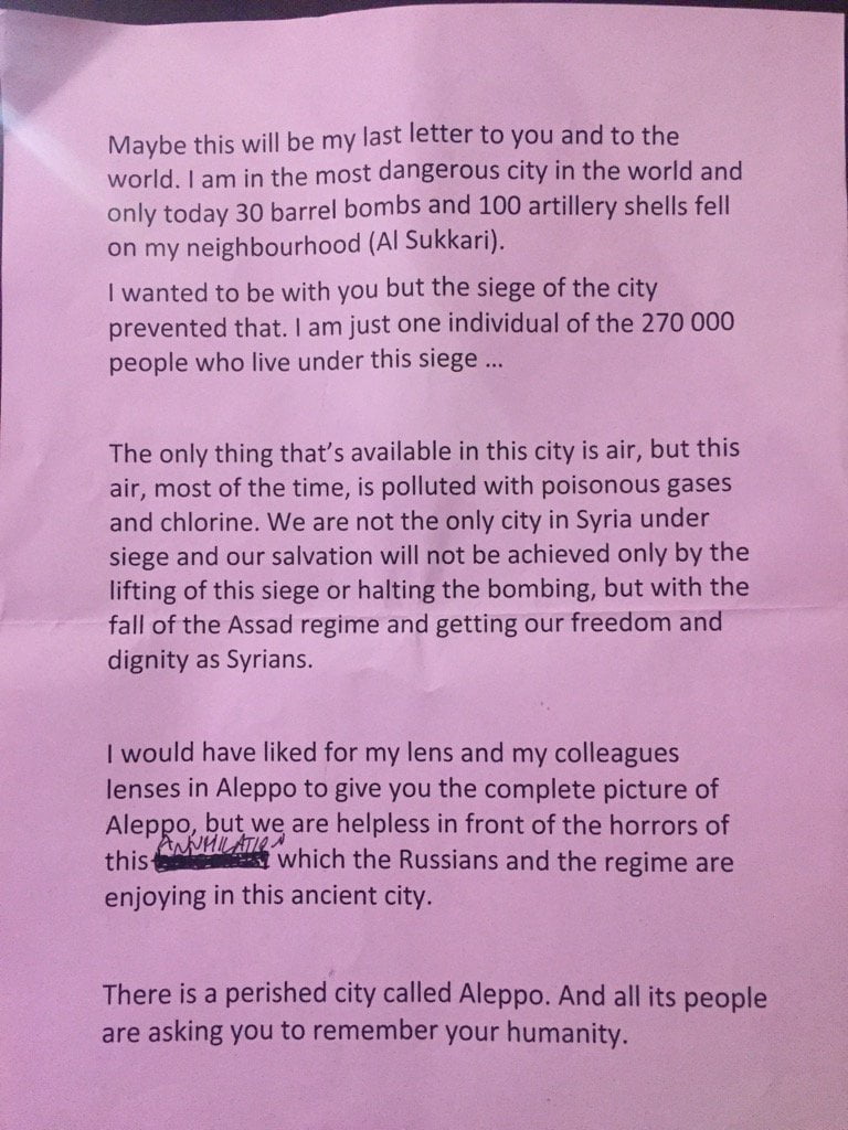 She hadn’t, or probably couldn’t, leave Aleppo, so wasn’t there to receive her awards, but the acceptance speech was given by her colleagues at Channel 4 News. They explained how her city had been bombed 30 times earlier that day. They read out a letter she’d written, which started ‘Maybe this will be my last letter to you and the World….’. Emotion, pure emotion.