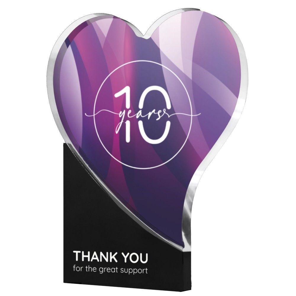 This 19.5 cm acrylic award features a heart shape and can be customised with engraving or full-colour print. Supplied in a white card box, with an optional presentation box upgrade. Lead time is 10 days.