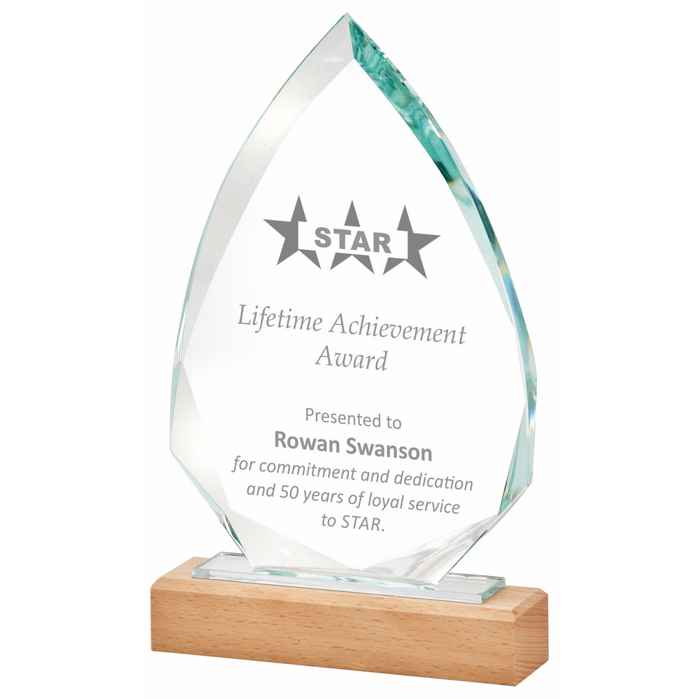 This Clear Glass, Beechwood Base Award can be customised with engraving and comes in a presentation box.