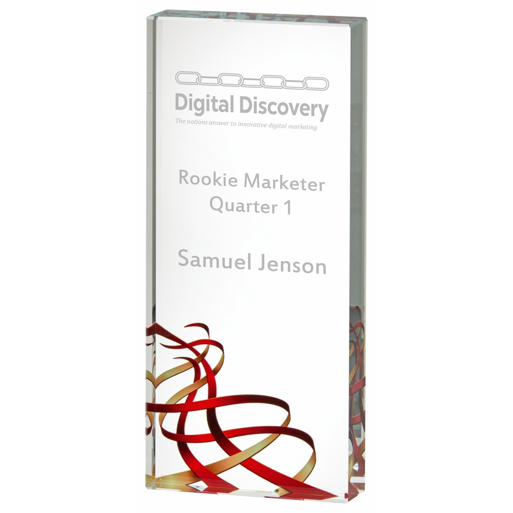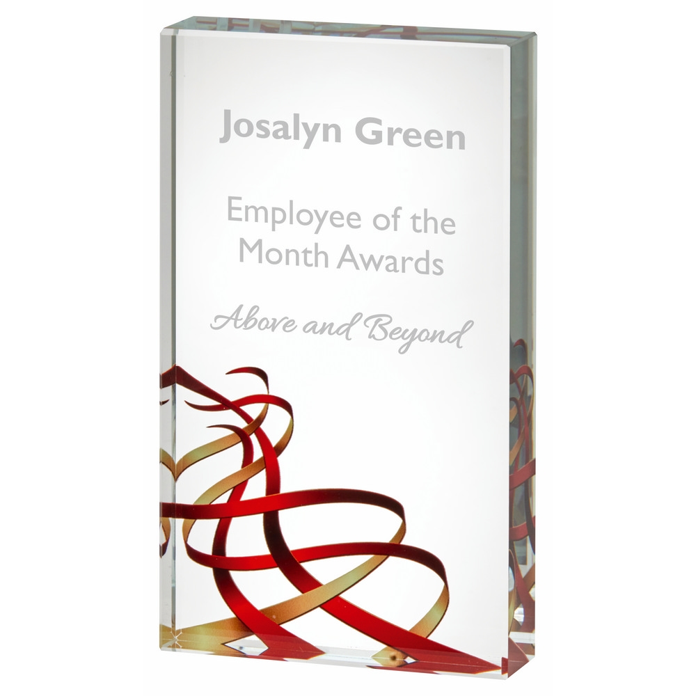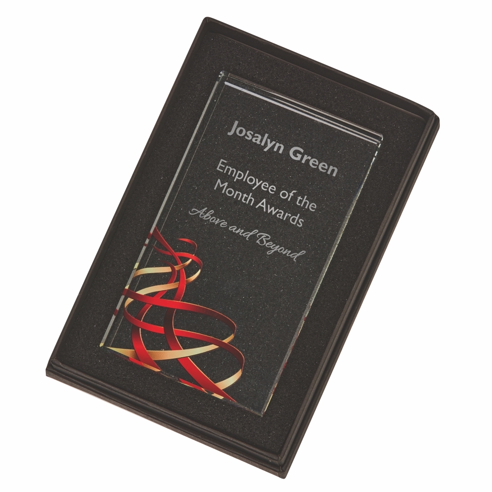 This Clear glass, Red Ribbon Award can be customised with engraving and comes in a presentation box.
