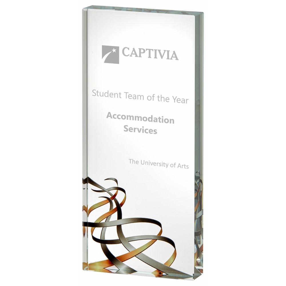 This Clear Glass, Gold, Silver Ribbon Award can be customised with engraving and comes in a presentation box.