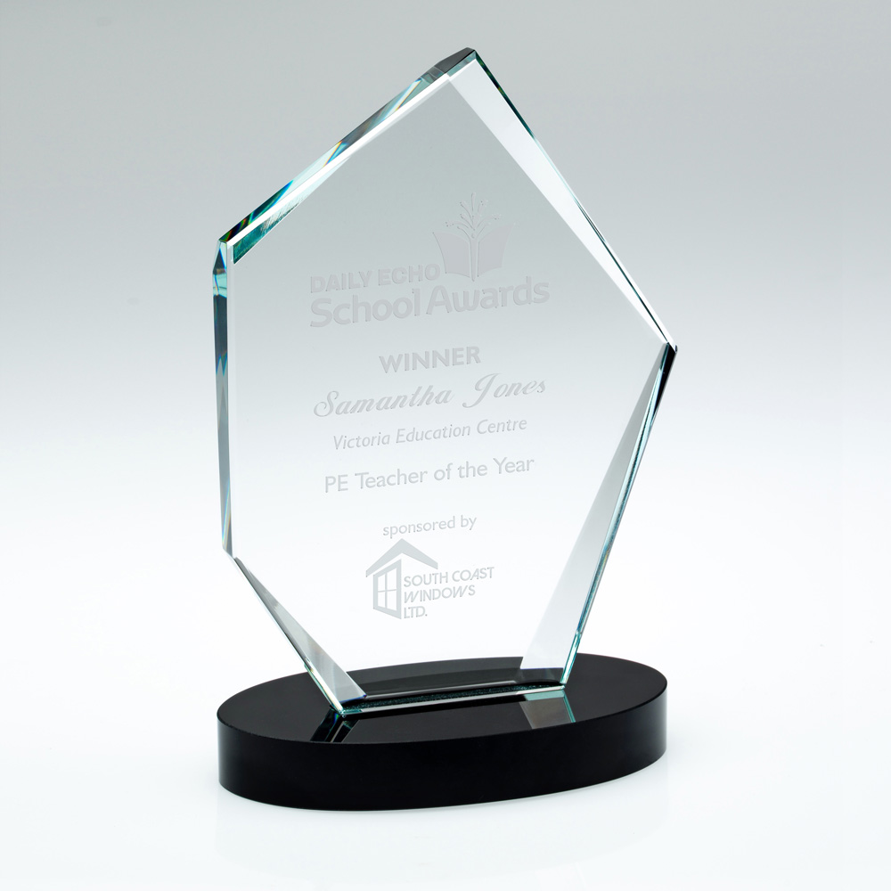 This Clear Glass Offset Diamond Plaque on Black Base Award, which comes in a presentation box can be engraved or colour printed to your specifications. It comes in three different sizes, and makes for a perfect award!