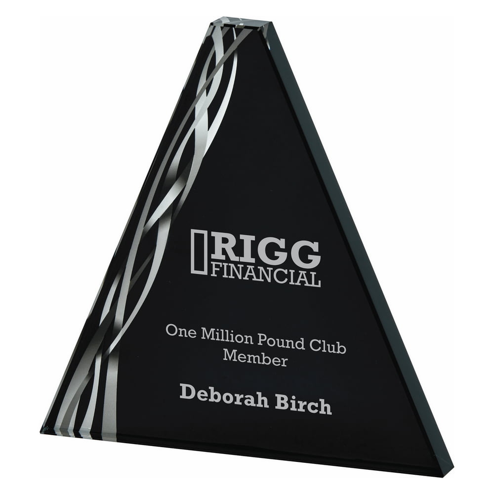 This Glass Triangle, Black with Silver Award can be engraved to your specifications.