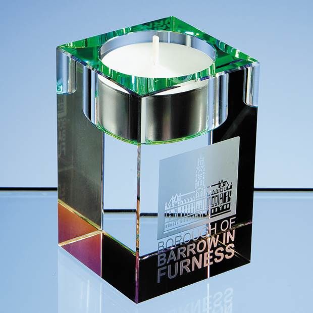 This Optical Crystal Tealight Holder can be engraved to your specifications.