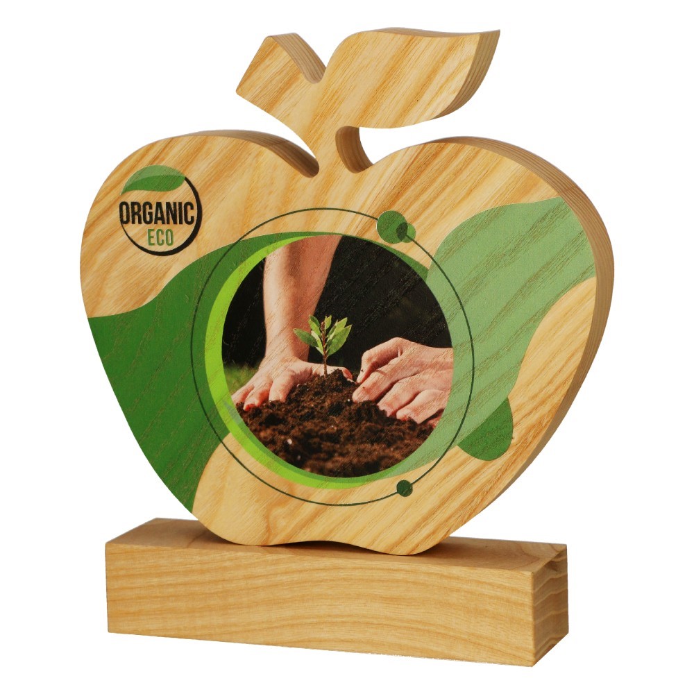 This 19 cm wooden award shaped like an apple can be customised with engraving or full-colour print. Supplied in a white card box, with an optional presentation box upgrade. Lead time is 10 days.